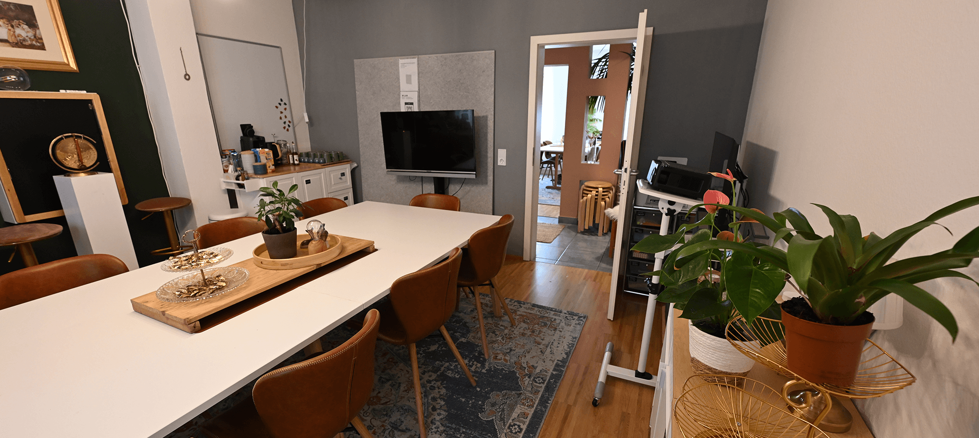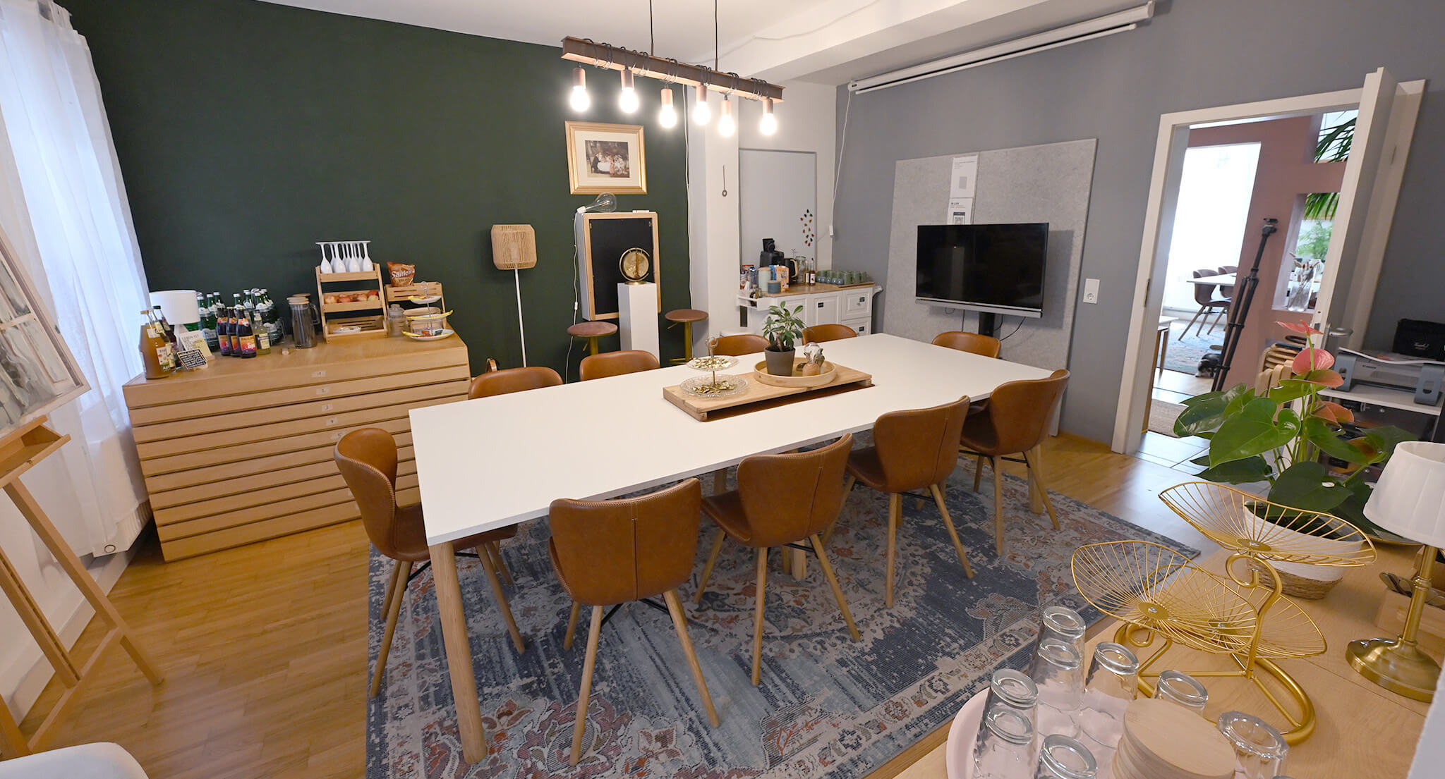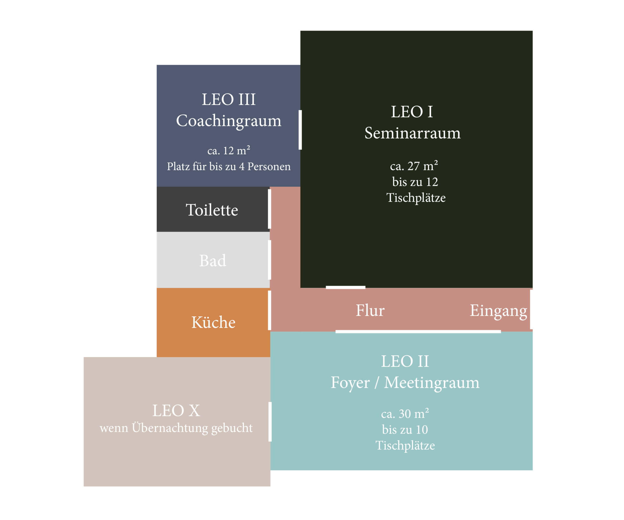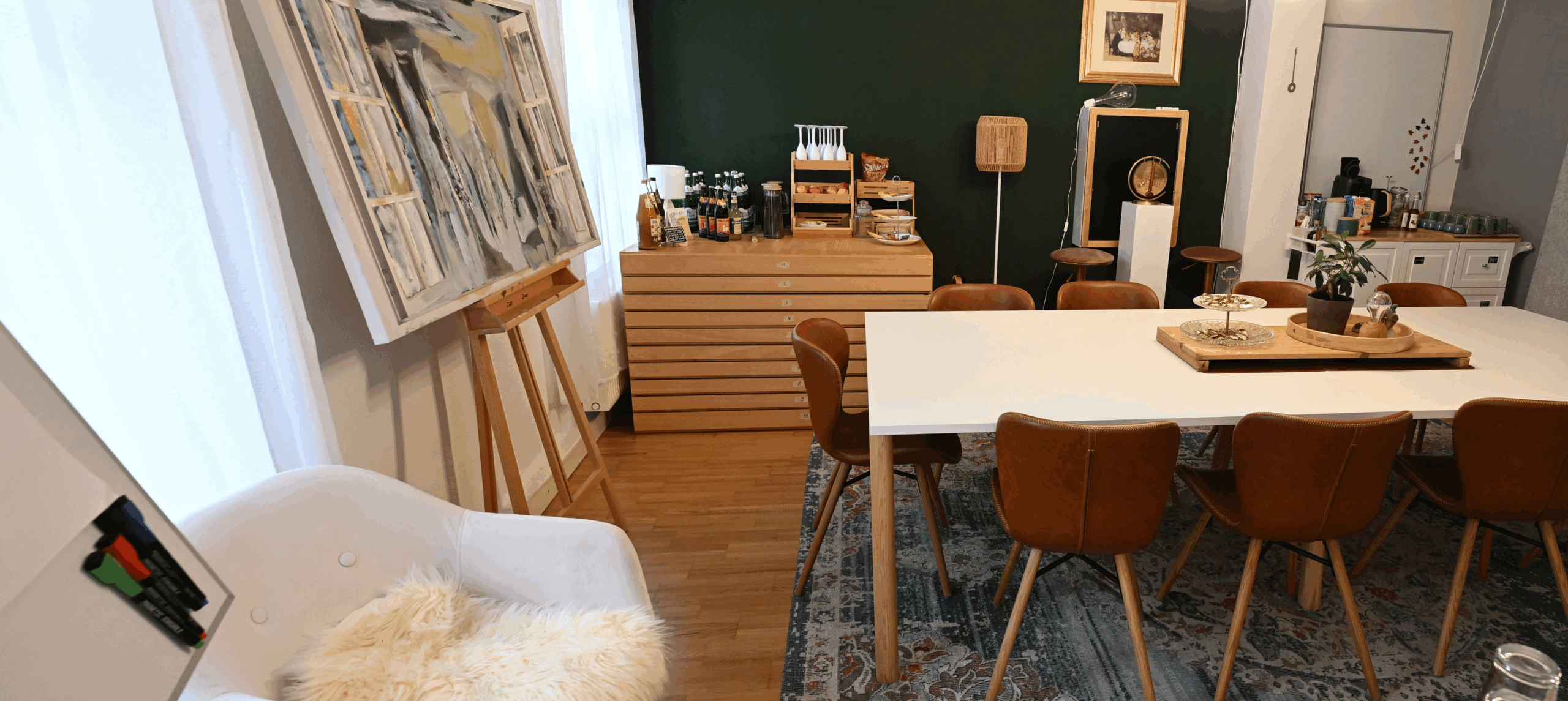 Die Location besteht aus drei Räumen, die sich im offenen Setting für bis zu 25 – an einer Tischgruppe bis zu 12 Personen eignen und welche durch eine voll ausgestattete Küche, hochwertige Arbeitsmittel sowie Spiel- und Kreativmaterialien ergänzt werden. Die Location steht jeweils nur einem Mietpartner zur Verfügung. Wir selbst sind – wenn nicht anders vereinbart – lediglich zur Übergabe und den Catering-Vorbereitungszeiten vor Ort.